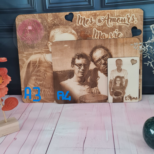 Je capturer un moment précieux, un sourire, un regard, que je graver dans le bois. Ce cadre en bois chaleureux unique, est une création qui devient un véritable trésor de famille.