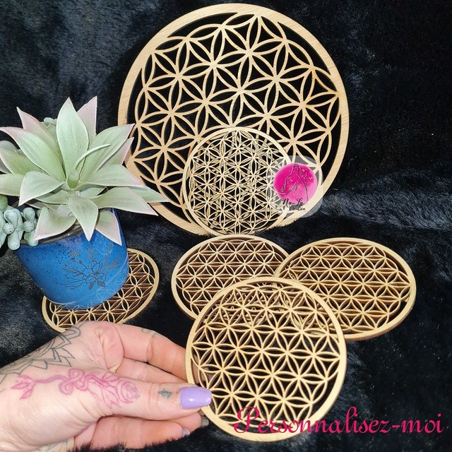 Vous cherchez une dĂ©coration pleine de sens et d’élĂ©gance ? Je crĂ©e pour vous une Fleur de Vie en bois, dĂ©coupĂ©e et gravĂ©e avec soin dans mon atelier. Symbole d’harmonie et d’énergie positive, elle apporte une touche chaleureuse et spirituelle Ă  votre intĂ©rieur.